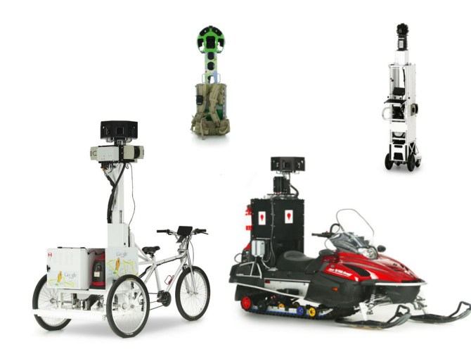 Entre los otros integrantes del equipo de Google Street View se encuentra una moto de nieve (ideal para fotografiar pistas de esquí), un triciclo (pensado para los callejones de las ciudades europeas), un carrito automatizado (generalmente utilizado para interiores como museos, estados o sitios históricos) y las trekkers (que básicamente son mochilas con cámaras incorporadas para lugares donde solo se puede acceder a pie).