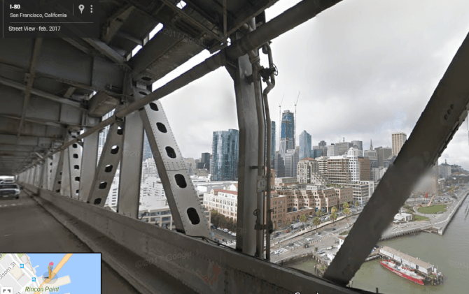 ¿Cuál fue la primera imagen 360 grados subida a Google Street View? De acuerdo con el blog de Google, la primera imagen publicada corresponde a la mitad del puente que comunica a la ciudad de San Francisco con Oakland.