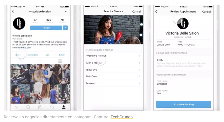 Por ejemplo un restaurante puede tener un perfil en Instagram y un botón que diga “Reserva” para después mostrarte un listado de mesas y horarios disponibles. Igual en un salón de belleza, con la elección del servicio que quieres contratar y cuándo podrías pasarte.