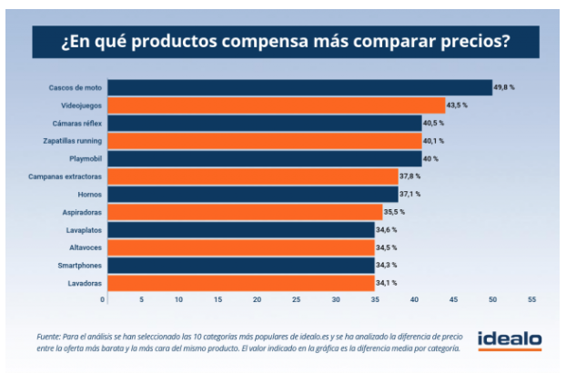Idealo ha elaborado un ranking de artículos en los que más se puede ahorrar, a través del estudio de la diferencia entre las ofertas más baratas y las más caras para exactamente los mismos productos y centrándose en las categorías con mayor demanda. Según este análisis, en el primer puesto de este ranking de productos se encuentran los cascos de moto. Un mismo modelo de este artículo puede ser encontrado en diferentes plataformas con hasta un 49,8 % de diferencia en el precio, dependiendo del lugar que se escoja para realizar la compra. Esto quiere decir que eligiendo la tienda adecuada el mismo casco nos podría salir a mitad de precio.