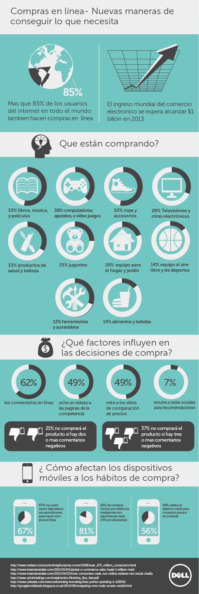 Pero la pregunta que muchos y nosotros también nos hacemos es ¿qué es lo que compran más los consumidores a través de la red? Para contestar esa pregunta tenemos una infografía creada por Dell en la que nos muestra eso y algunas cosas más como qué factores influyen en la decisión de compra o cómo afectan los dispositivos móviles a los hábitos de compra.