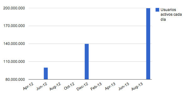 Éstos son los de Twitter. Desde los 100 millones que la compañía anunció en junio de 2012 hasta la cifra más reciente: 200 millones en septiembre de 2013.