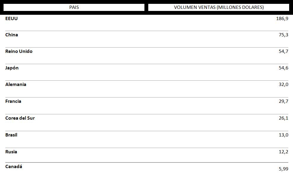 La lista que queda encabezada por Estados Unidos con un volumen de compra de 186,9 millones de dólares, tiene el segundo lugar a China, que con 75,3 millones de dólares de compras a través de Internet, ni siquiera se sitúan el 50% del volumen estadounidense, algo que tampoco logra desde luego Reino Unido, que se sitúa en la tercera plaza de esta particular lista con 54,7 millones de euros, muy cerca del cuarto puesto que ocupa Japón con 54,6 millones de euros.