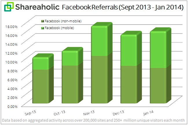 Para entrar en contexto creo que es importante que tengamos en mente lo que significa este tráfico de "referencia a otros sitios web"; cuando se habla de referral nos estamos refiriendo al tráfico generado cuando se hace clic sobre un enlace compartido a través de Facebook, un tráfico saliente desde Facebook hacia otros sitios web. Precisamente, según los datos que ha publicado el servicio Shareaholic (bastante conocido por proveer de botones para compartir contenidos en distintas redes sociales), más de la mitad del tráfico que genera Facebook hacia otros sitios web tiene su origen en dispositivos móviles; dicho de otra forma, más de la mitad de los usuarios que hacen clic en enlaces compartidos en Facebook están accediendo a esta red social desde un dispositivo móvil.