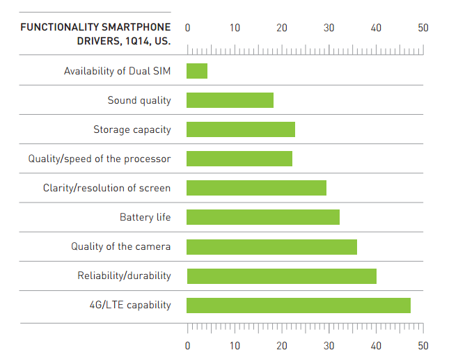 ¿Pero qué es lo que más convence a nivel funcional a la hora de comprar un dispositivo móvil? En una escala de 0 a 5, muy cerca del límite máximo se sitúa la tecnología 4G LTE, seguida a muy poca distancia por la fiabilidad y la calidad de la cámara. Otro factores que pueden influir son la resolución de la pantalla, la velocidad del procesador o la capacidad de almacenamiento.