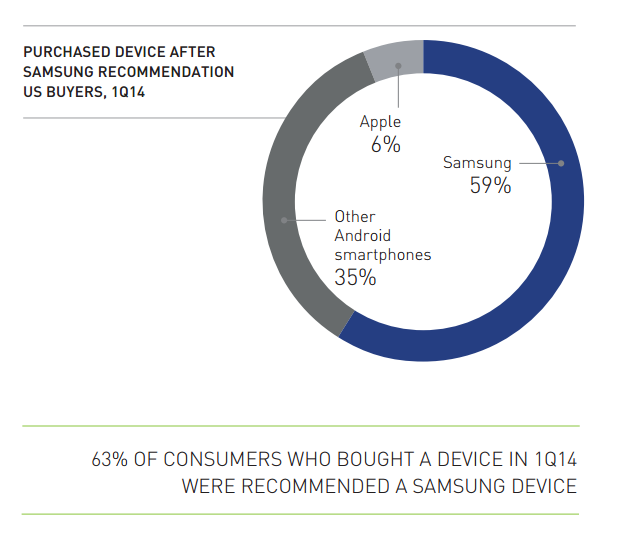 En el caso de Samsung, la otra compañía mencionada, el éxito está respaldado por la promoción de los vendedores en las tiendas físicas. El informe desvela que en el primer trimestre del 2014, a 63% de los compradores se le han sugerido un dispositivo de la marca coreana, doblando la tasa de recomendación en el caso de Apple e incluso llegando hasta diez veces más en comparación con Nokia (ahora de Microsoft). Las recomendaciones han tenido un impacto muy grande en las ventas de Samsung. De los que han sido aconsejados que apuesten por unos de sus terminales, un 59% han acabado comprando un dispositivo móvil de la marca y sólo 6% se han decidido por el iPhone.
