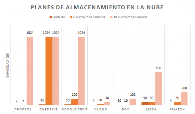 De esta forma, plantan cara al resto de alternativas y se posicionan muy bien en los planes de pago. Siguen sin ser los más baratos (OneDrive arrasa en ese sentido) pero desde luego mejoran mucho lo que tenían antes. En la siguiente tabla y gráfico tenéis cómo queda la situación ahora.