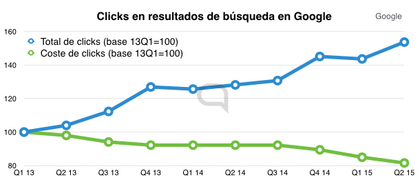 Google lleva años perdiendo coste por cada click. Muchos factores influyen. Entre los intuitivos están el aumento en países emergentes con campañas de marketing ajustadas. Pero en móvil, al haber menos anuncios mostrados a la vez, debería ser mayor el CPC al incrementar la competencia, pero no es así. Tiene más peso las expansiones de oportunidades que las nuevas limitaciones impuestas en los anuncios móviles de Google.