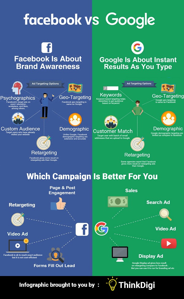 Según la infografía creada por Thinkdigi, todo depende. Y es que te convendrá poner un anuncio en una u otra plataforma en función de cuál sea tu objetivo.