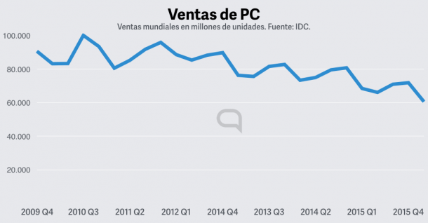 El primer trimestre de 2016 ha sido otro episodio catastrófico de ventas en el mercado de los ordenadores de escritorio y portátiles, con 60,6 millones de unidades vendidas en el mundo, bajando de 68,4 millones el mismo trimestre del pasado año, niveles de 2007 de ventas.
