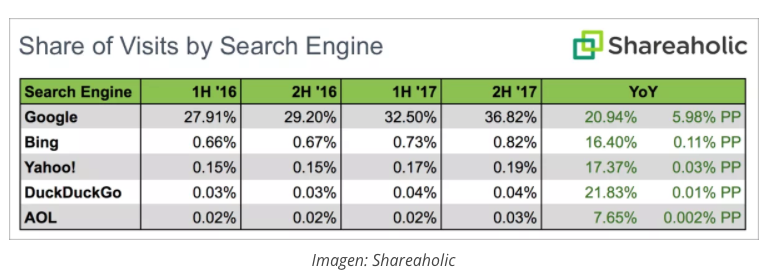 Contra todos los pronósticos, durante 2017 el tráfico procedente de las búsquedas web superó al de las redes sociales, una tendencia que no había podido revertir desde el 2014. De acuerdo a los datos revelados por Shareaholic, el 34,8% de las visitas a los sitios web durante 2017 provenían de los buscadores en comparación con el 25,6% que obtuvieron las redes sociales.