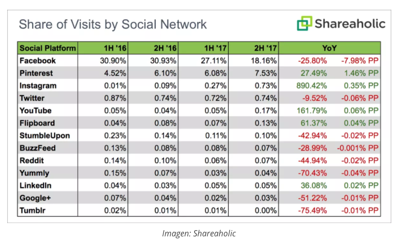 Si bien Facebook sigue siendo una fuente importante del tráfico web del mundo, su porcentaje de visitas ha caído estrepitosamente perdiendo un 25,80% anual, presentando una caída del 12,7% entre la segunda mitad del 2016 y la segunda del 2017.